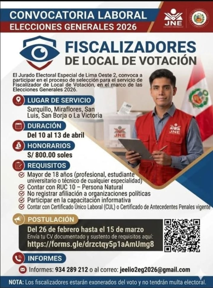 El Jurado Electoral Especial de Lima Oeste 2, convoca a participar en el proceso de selección para el servicio de Fiscalizador de Local de Votación, en el marco de las Elecciones Generales 2026.